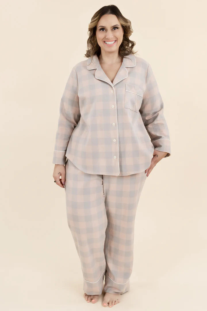 The Carolyn top features a classic notched collar, curved hem and breast pocket with three sleeve options. For a matching pajama set, choose between a straight-legged pant (with or without cuff) or a cuffed short. Both pants and shorts feature an elasticized waist, pockets and a faux fly. Personalize Carolyn by adding contrasting piping details for an elegant finish.